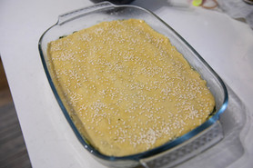 In a tray, measuring approximately 29cm x 21cm, brush a beaten egg along the base of the tray to prevent the pastry from sticking. Roll out your pastry to the size of you tray and place it into the base.